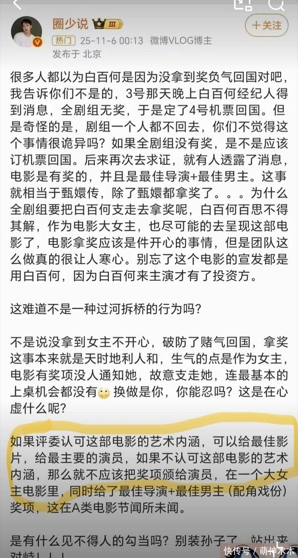 从白百何好友的发文看,这部电影投资都是靠白百何拉来,结果片方过河拆桥,不让她上桌,让白百何自己都百思不得其解。而明明电影得奖了,却把她支开参加闭幕式领奖,到底有什么见不得人的?白百何好友直接喊话出来对峙。