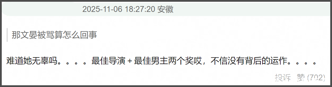 评论区关于沪圈的爆料,更是将王传君和评委文晏推到风口浪尖上,甚至颁奖礼当天,王传君得奖的时候,都被满屏“黑幕”占据。